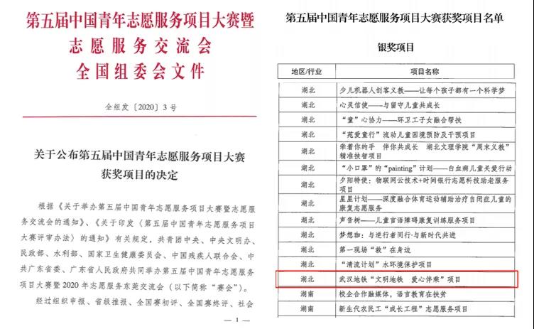 武漢地鐵“文明地鐵 愛心伴乘”項目榮獲第五屆中國青年志愿服務項目大賽銀獎
