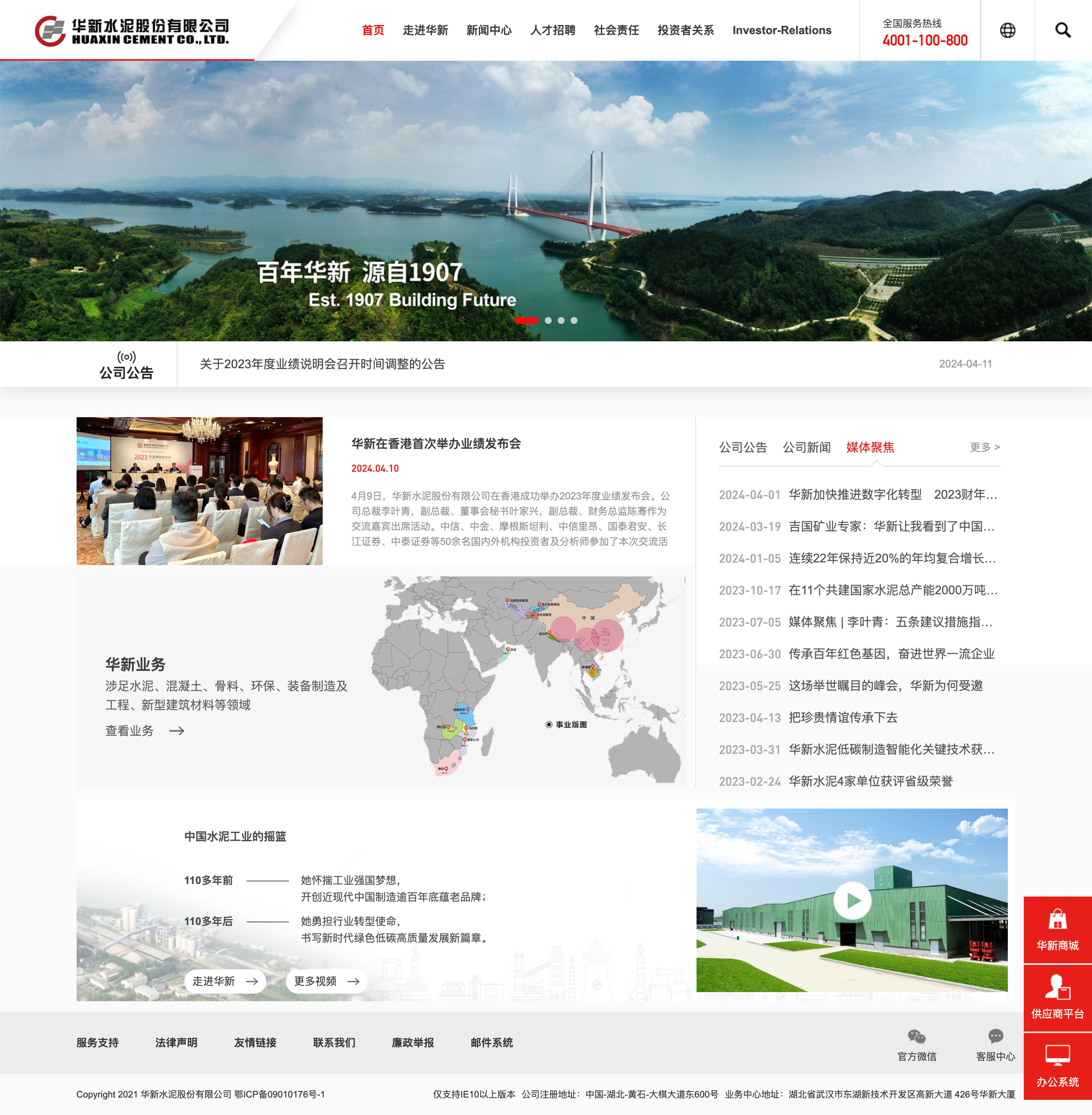 華新水泥股份有限公司始創于1907年,被譽為中國水泥工業的搖籃,110多年來為國家和地方經濟社會發展作出了突出貢獻。華新水泥企業資信為“AAA”級,“華新堡壘”為中國馳名商標。北京上世紀50年代的十大建筑、北京亞運村、葛洲壩、京珠高速公路,長江中下游數十座公路和鐵路大橋、舉世矚目的三峽工程等國家重點工程,均選用華新水泥。