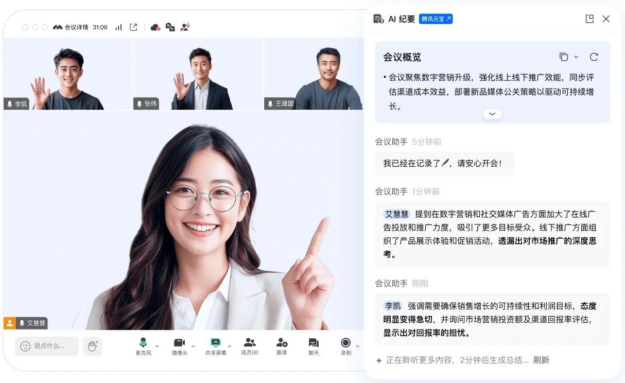 騰訊會議AI紀要,會主動總結會議內容的AI紀要。開啟后僅自己可見,幫助你智能識別關鍵紀要,實時追蹤關鍵進展。