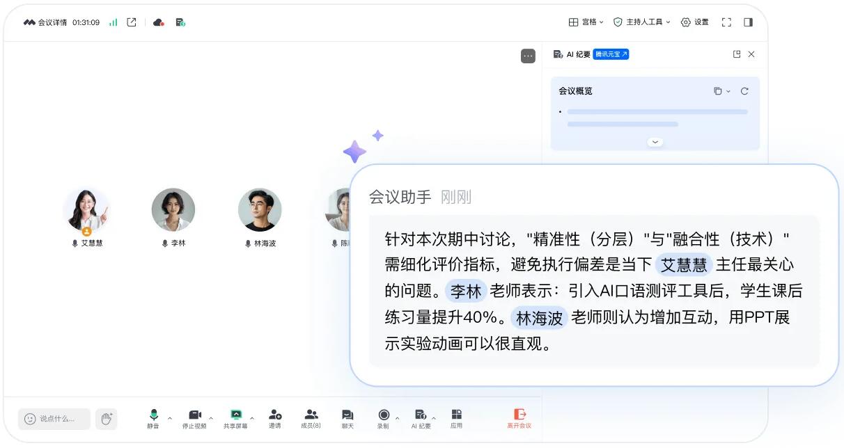AI智能提煉總結會議結論與待辦,并根據當前討論實時刷新。決策要點、任務分配、關鍵節點清晰呈現,幫助參會人隨時掌握會議成果。還支持實時識別,并高亮標注發言人。會中重點一目了然,會后職責明確,執行高效。