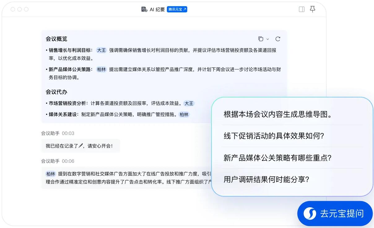 支持AI紀要一鍵導入騰訊元寶,基于AI紀要內容繼續為您答疑解惑,梳理邏輯鏈條,聯網搜索相關信息,生成行動計劃等等。讓會議洞見進一步轉化,發揮更大價值。