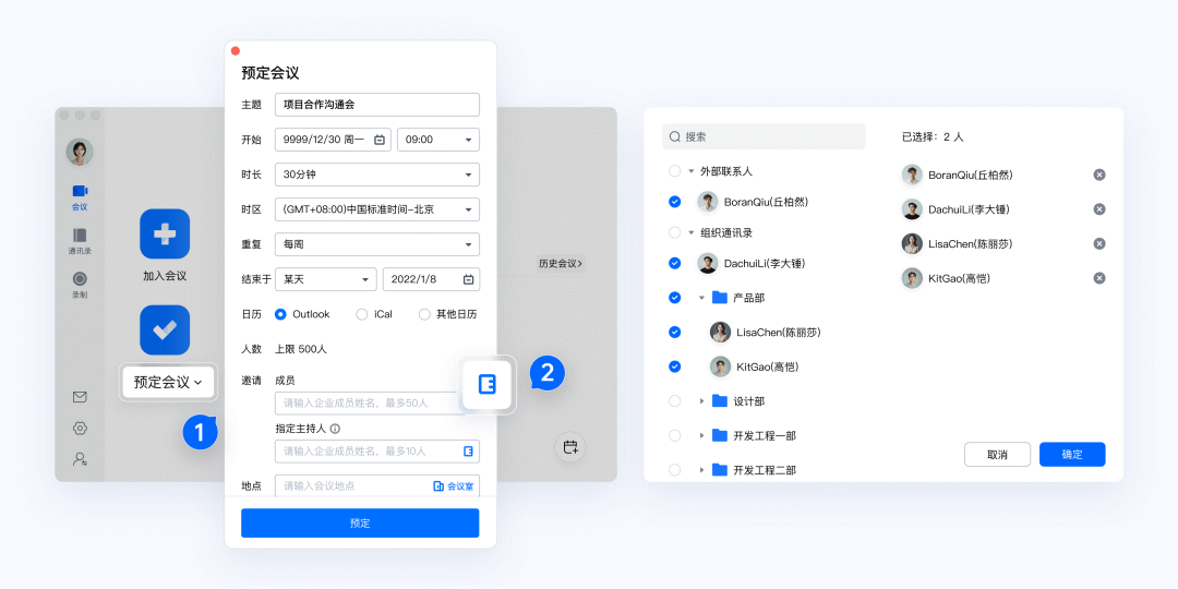 現在,趕緊在騰訊會議上創建您的組織吧!預定會議時,可以直接在通訊錄勾選內外部聯系人,日程將自動呈現在對方會議列表上,到點基于騰訊會議的響鈴以及公眾號等多渠道提醒,保證參會人準時上會。