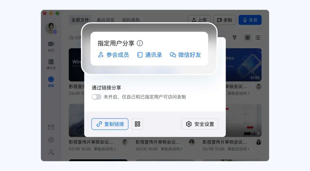 會后,您可以將云錄制快捷分享給您的通訊錄內外部聯系人,對方直接在“騰訊會議客戶端-錄制”就能查看,既方便又防止云錄制鏈接泄露。
