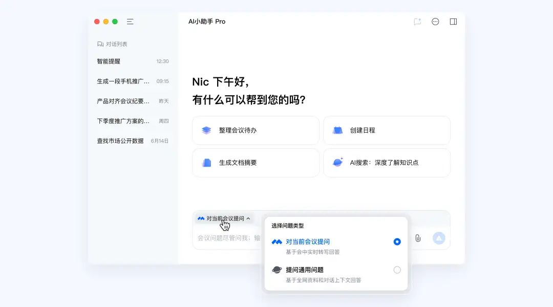 AI小助手Pro全程為您聽著,可以回答您關心的任何會議問題,如總結會議結論和待辦等;
