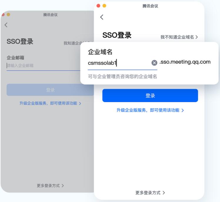 ◎ 您可將騰訊會議對接到已有的組織/企業賬戶認證體系中,通過SSO,輸入企業域名或企業郵箱,即可登錄騰訊會議。