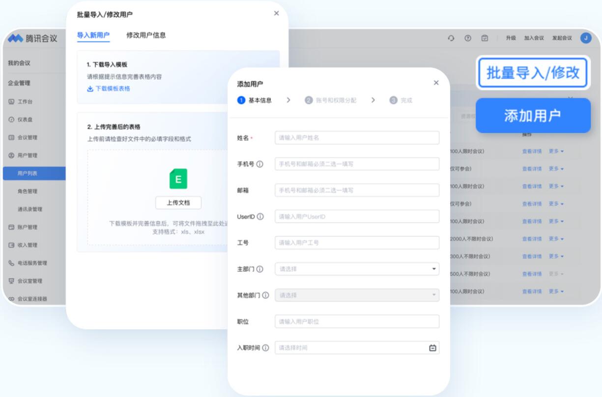 通過電腦端訪問騰訊會議官網,點擊【個人頭像】-【企業管理】-【用戶管理】,您可以下載模版進行批量導入,也可以逐個添加企業成員。