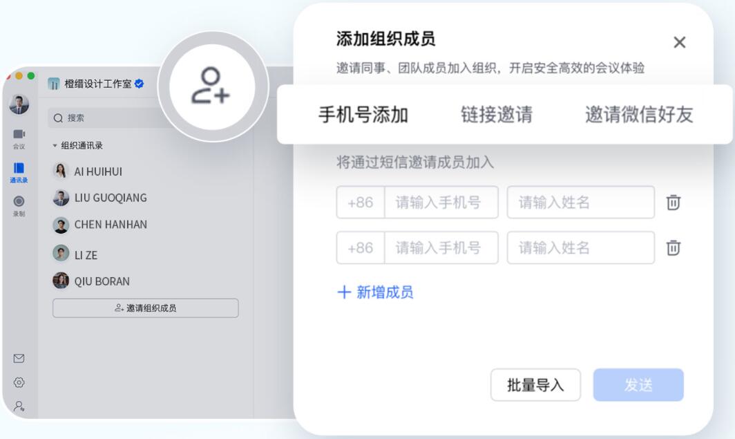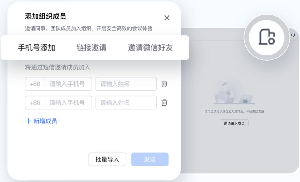 ◎ 騰訊會議APP也為您提供組織管理能力,前往【通訊錄】,點擊界面右上角的【組織管理】-【添加成員】, 即可邀請。