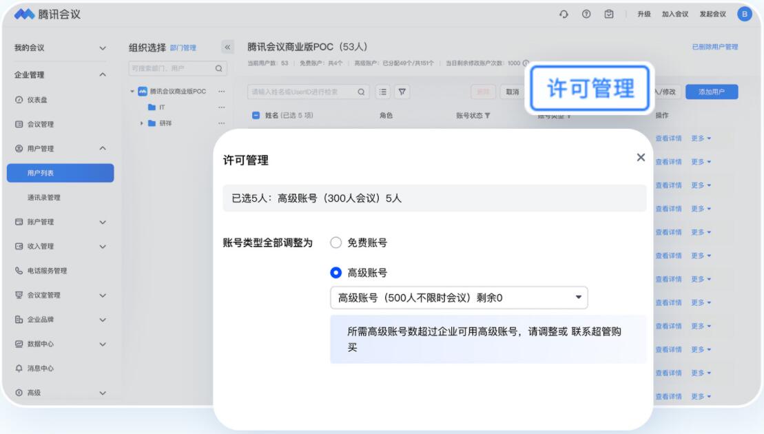 ◎ 批量統一分配:勾選您想要分配資源的所有用戶,點擊【許可管理】,進行批量處理,實現快速分配。