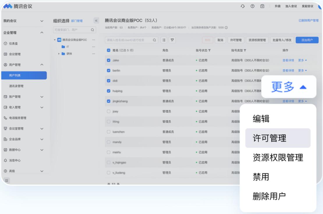 ◎ 單個員工分配:在企業成員列表中找到該用戶,點擊【更多】-【許可管理】,完成分配。