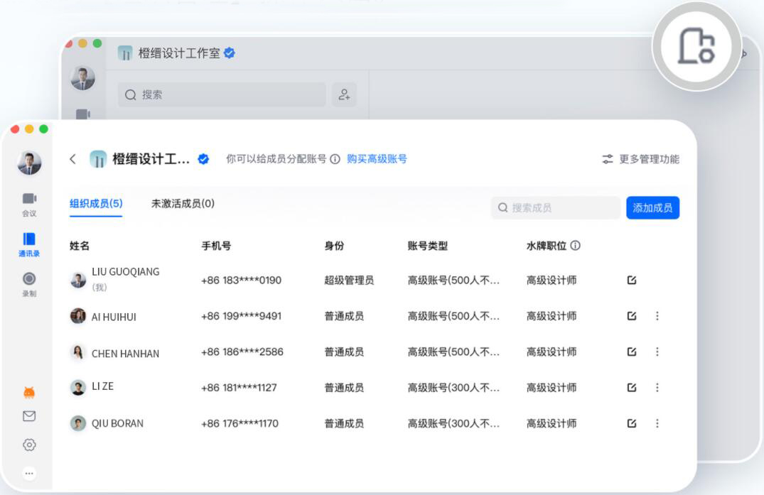 ◎ 打開騰訊會議APP,點擊【通訊錄】,在界面右上角點擊【組織管理】,即可對組織成員賬號類型進行分配。在設置頁,您也能查看到【組織管理】操作入口。