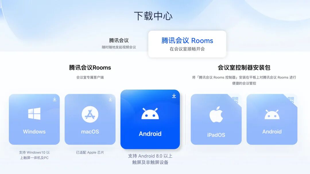 方式一:登錄設(shè)備應(yīng)用市場(chǎng)搜索騰訊會(huì)議Rooms,下載安裝;目前Maxhub、Huawei、Hisense、Horion、TCL、Lenovo、Philips等品牌商業(yè)顯示設(shè)備已上架。方式二:登錄騰訊會(huì)議官網(wǎng),下載通用包,用u盤拷貝至設(shè)備安裝。