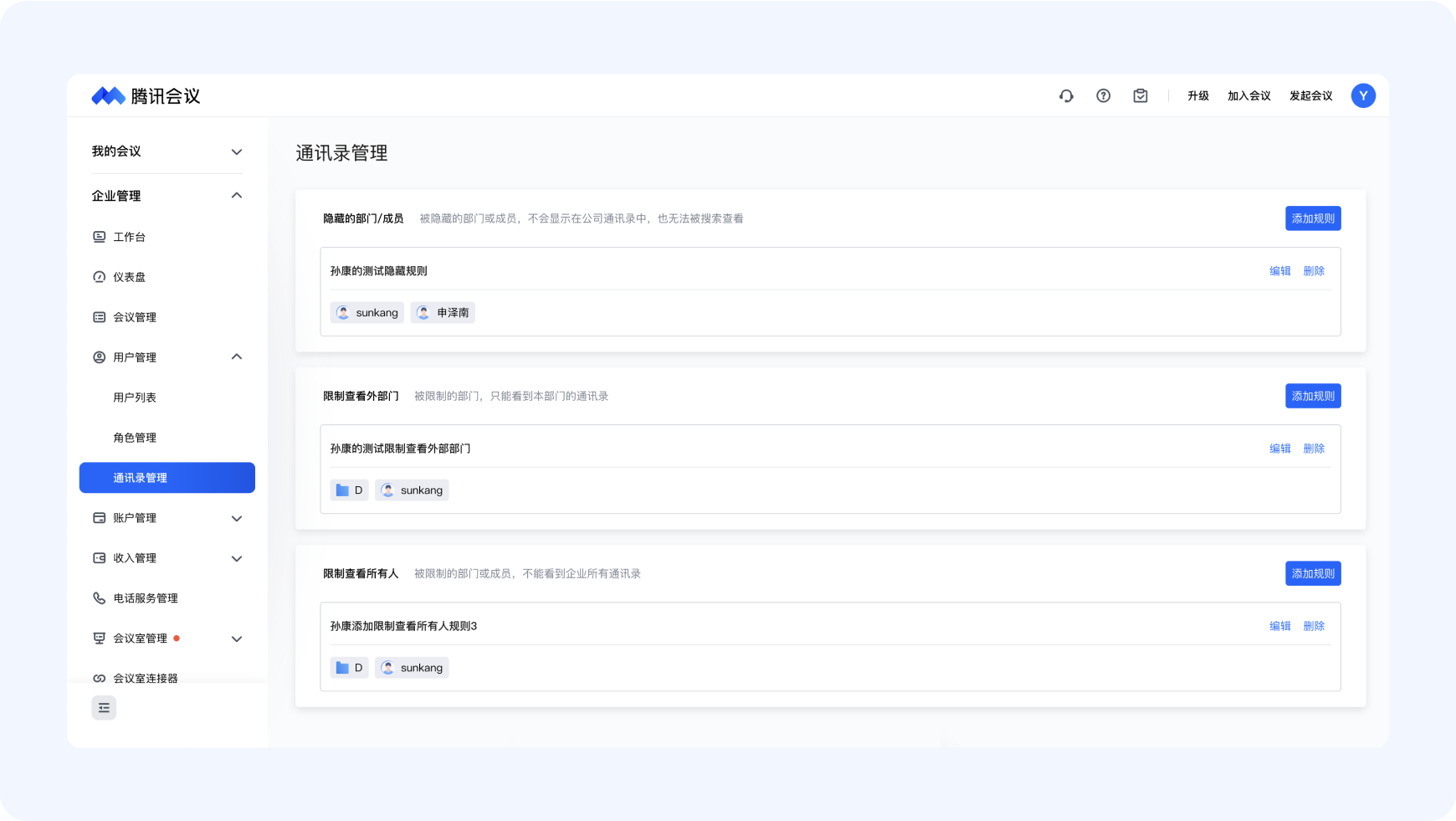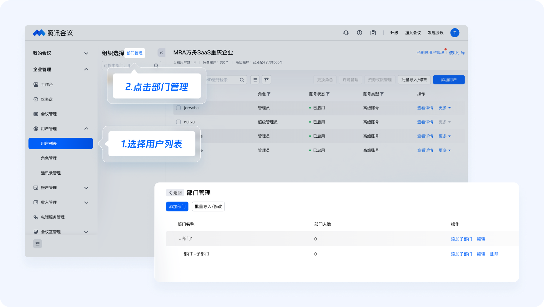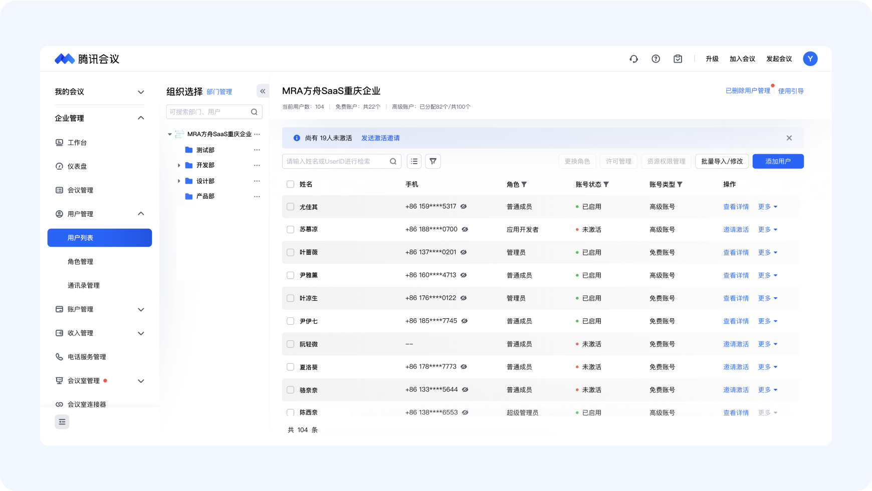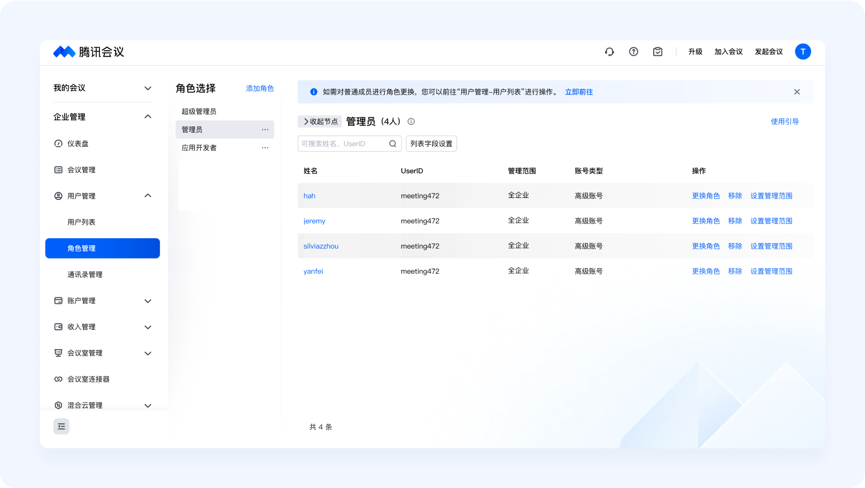 ● 管理員:管理員擁有訪問和管理企業賬戶的廣泛權限,能夠輔助超級管理員對企業組織會議資源、成員進行管理。