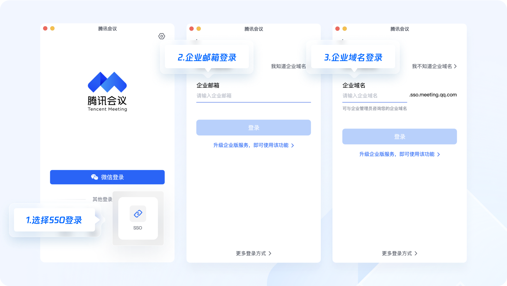 您可將騰訊會議對接到已有的組織/企業賬戶認證體系中,通過SSO,輸入企業域名或企業郵箱,即可登錄騰訊會議。