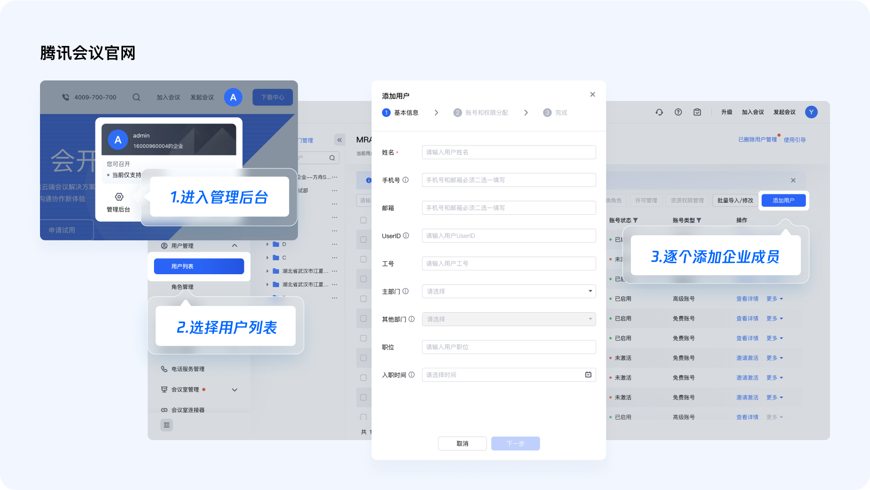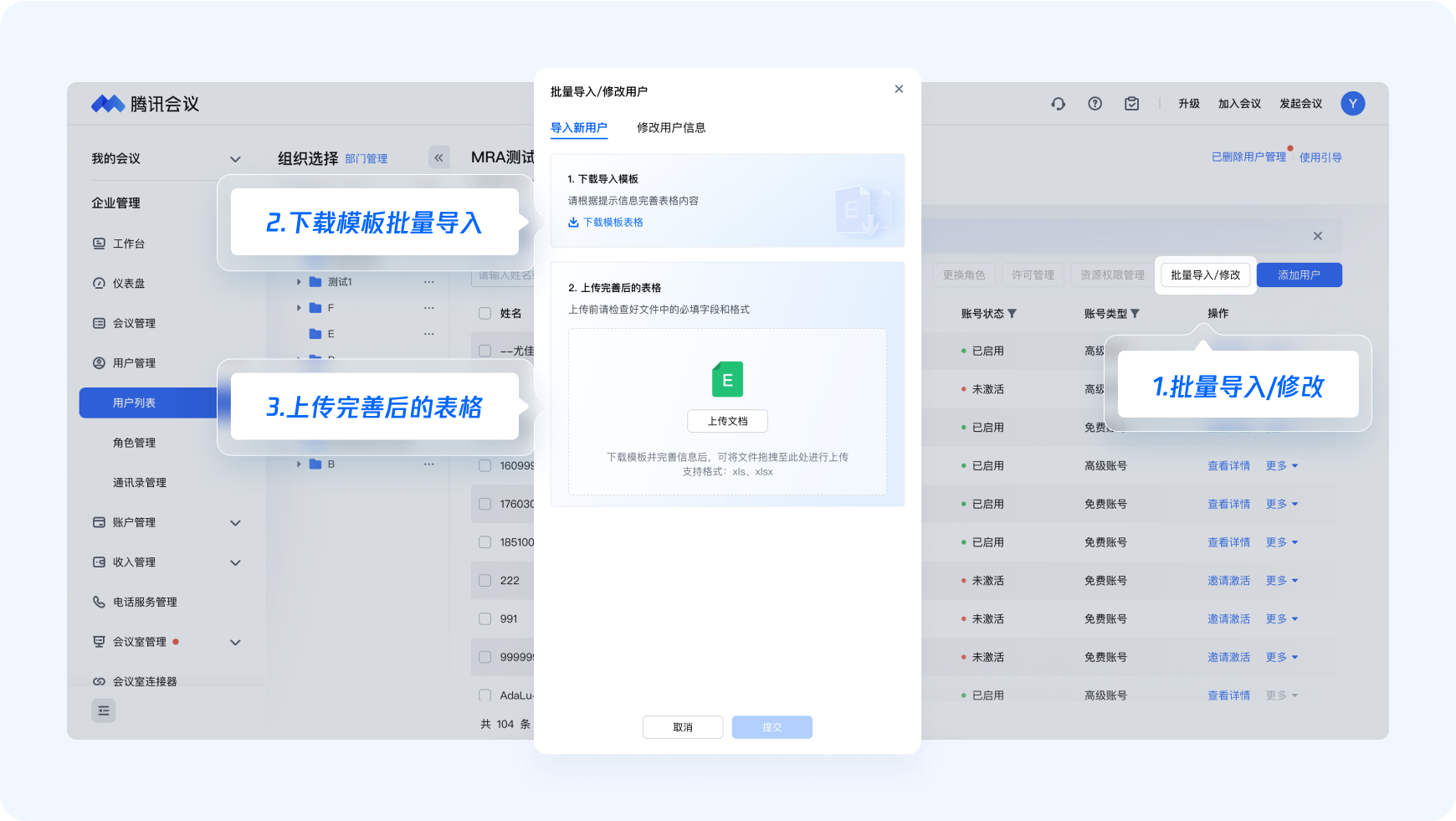 進入騰訊會議官網,點擊【個人頭像】-【企業管理】-【用戶管理】,您可以下載模版進行批量導入,也可以逐個添加企業成員。