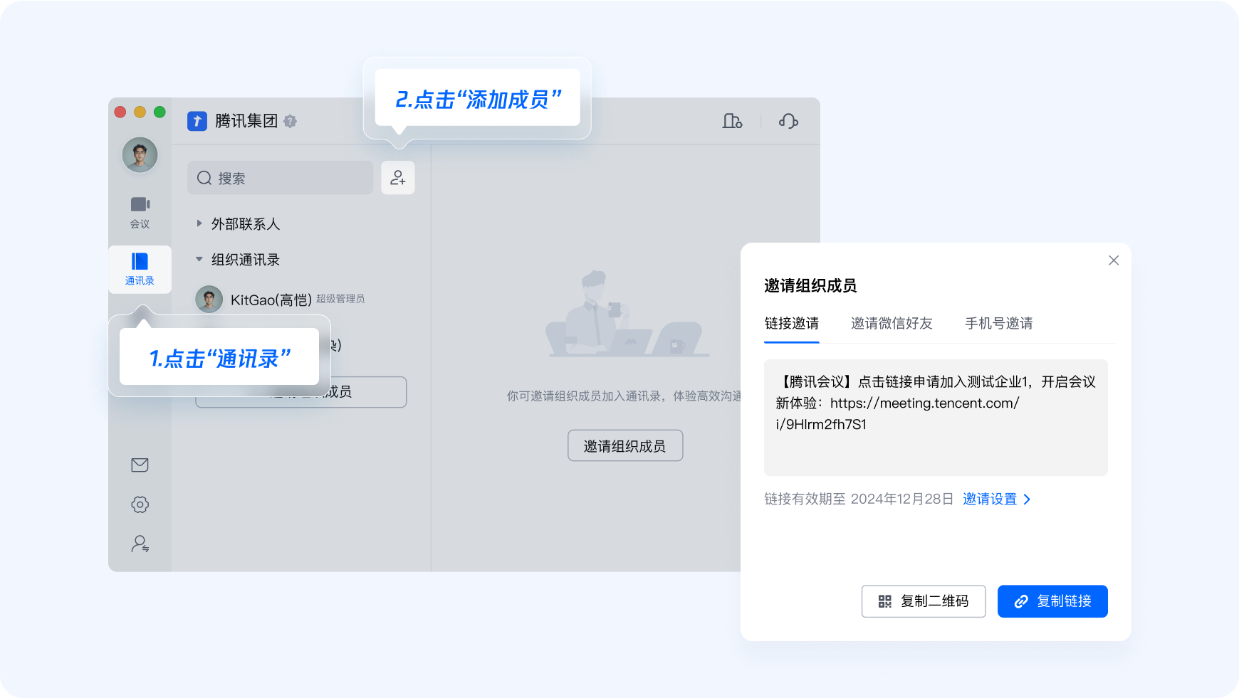 作為企業管理員,您可以在騰訊會議APP、官網通過名單導入、企業通訊錄對接等方式邀請成員進入組織,企業管理員將擁有專屬的【企業管理后臺】,以實現更好的會議資源分配、管理和運維,讓組織成員高效協作。