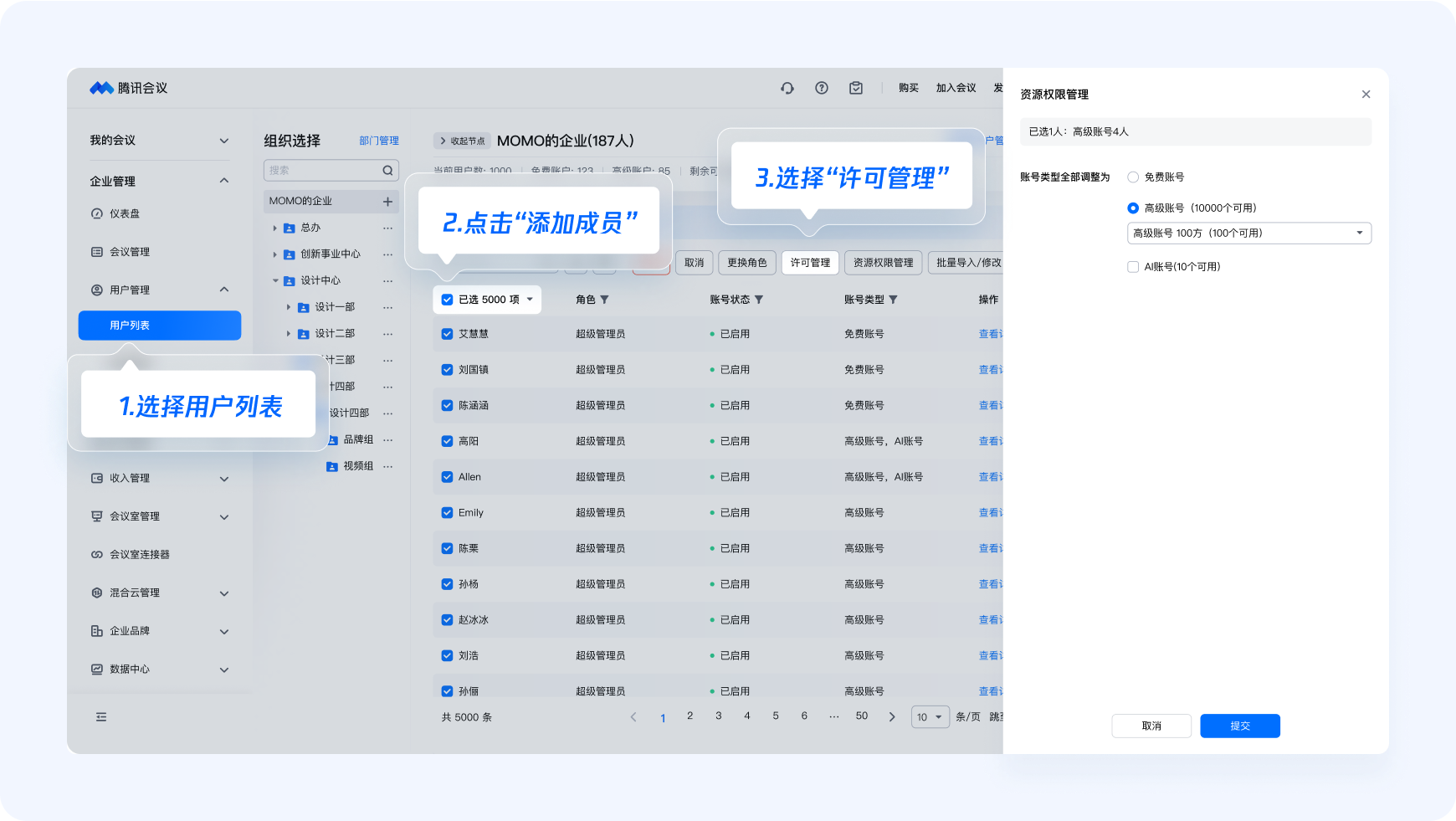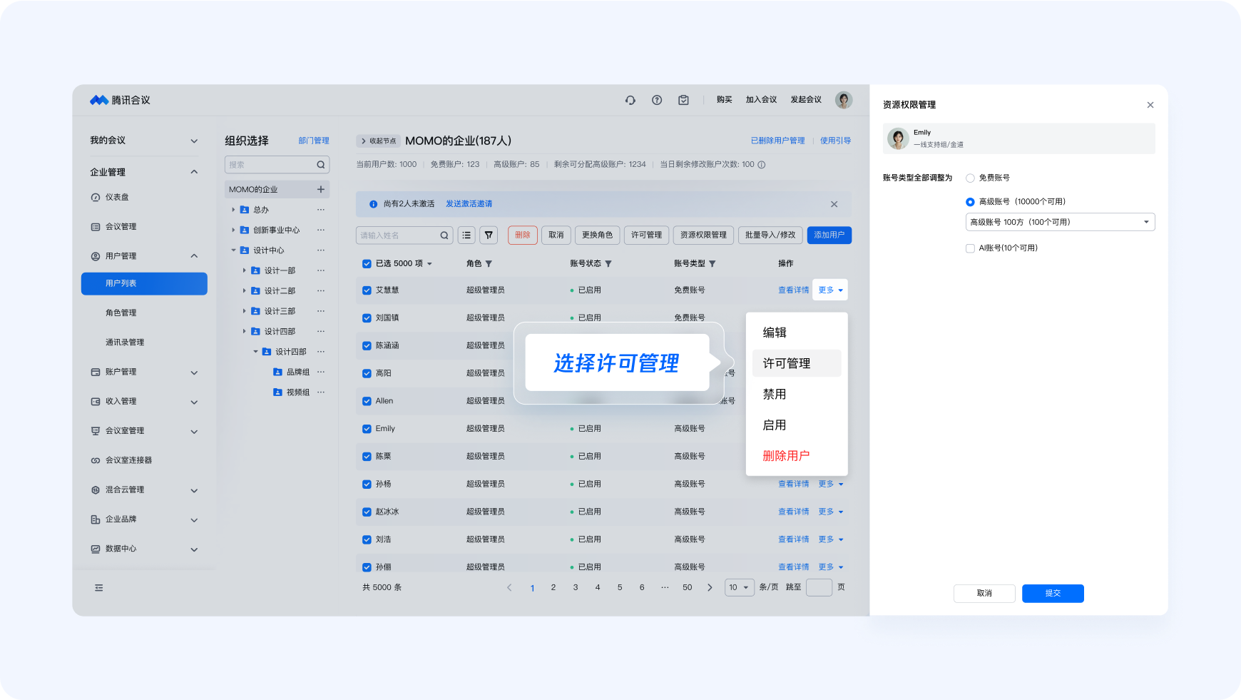勾選您想要分配資源的所有用戶,點擊【許可管理】,進行批量處理,實現快速分配。
