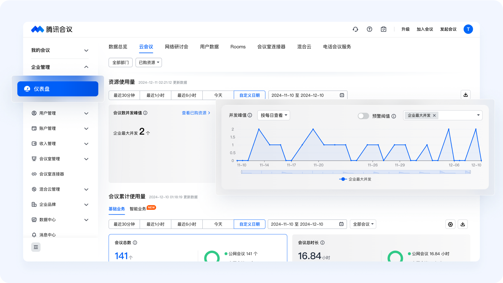 騰訊會議為管理員提供專業(yè)的可視化儀表盤,將企業(yè)所有的會議資源的使用情況進行統(tǒng)計分析,并以圖表的形式呈現(xiàn),以便管理員更好地查詢、管理會議資源。
