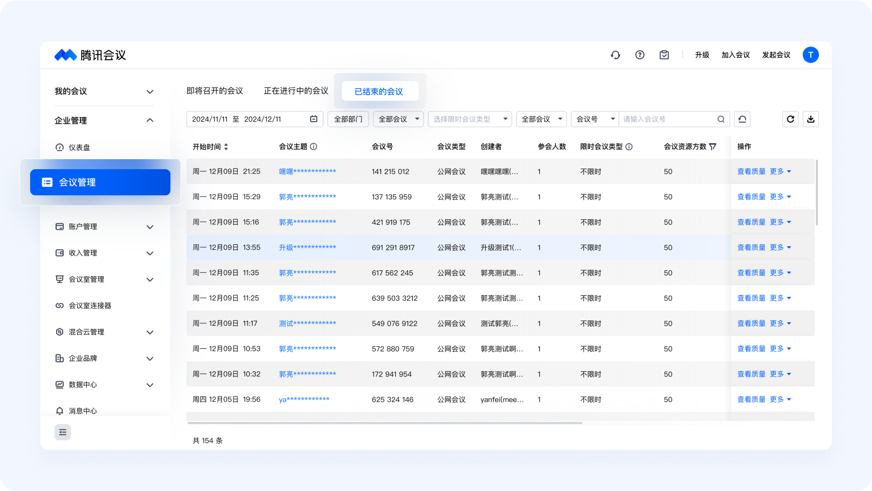 在企業(yè)管理后臺-【會議管理】中,作為企業(yè)管理員,您可以查詢到企業(yè)當(dāng)前即將召開、正在進行中、已結(jié)束的會議,并對這些會議進行一定管理。