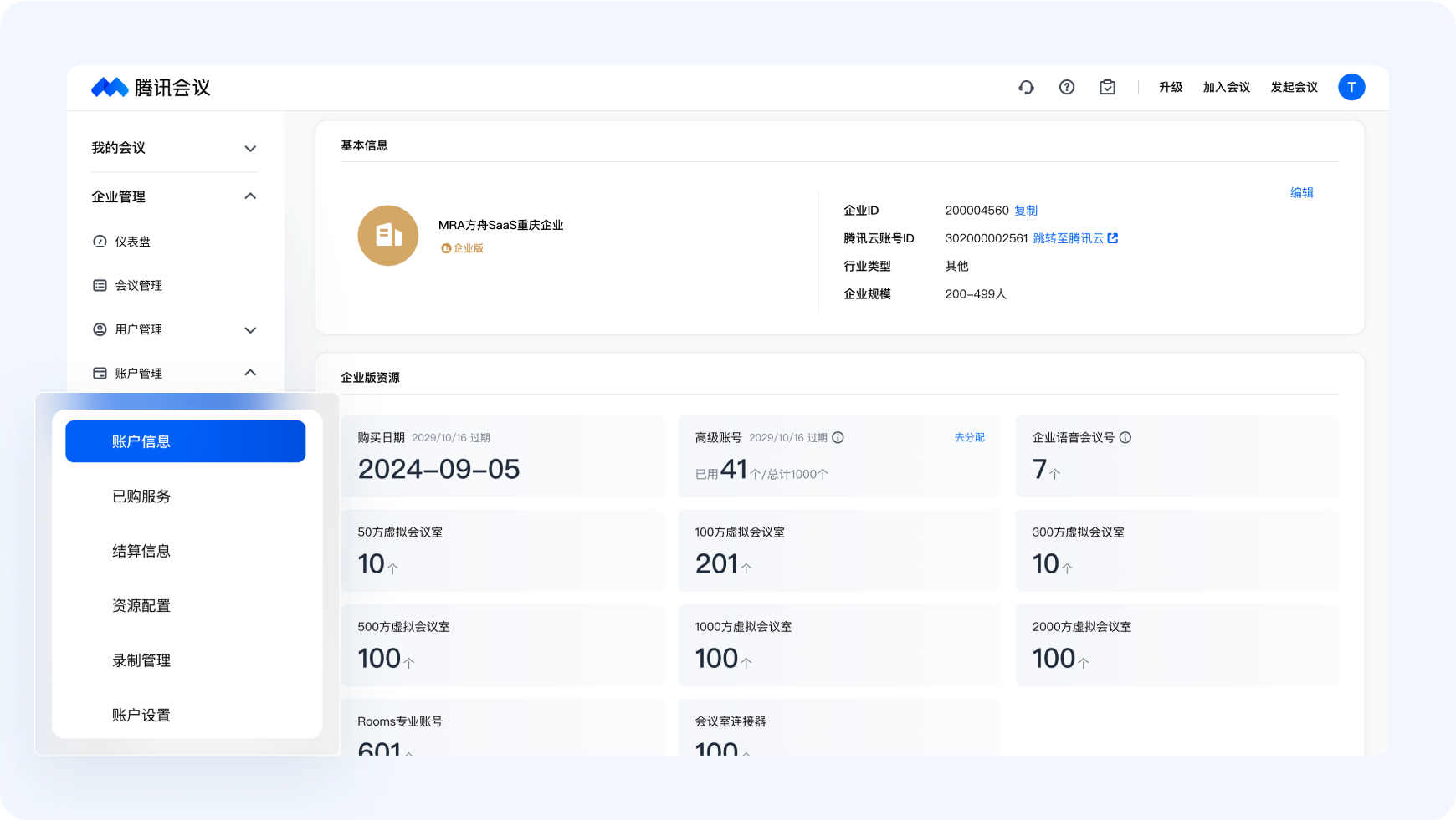 作為管理員,您必定需要對企業(yè)當(dāng)前會議資源使用情況進行了解。您可以前往企業(yè)管理后臺【賬戶管理】,可以看到本企業(yè)賬戶的資源購買和使用的基本情況。