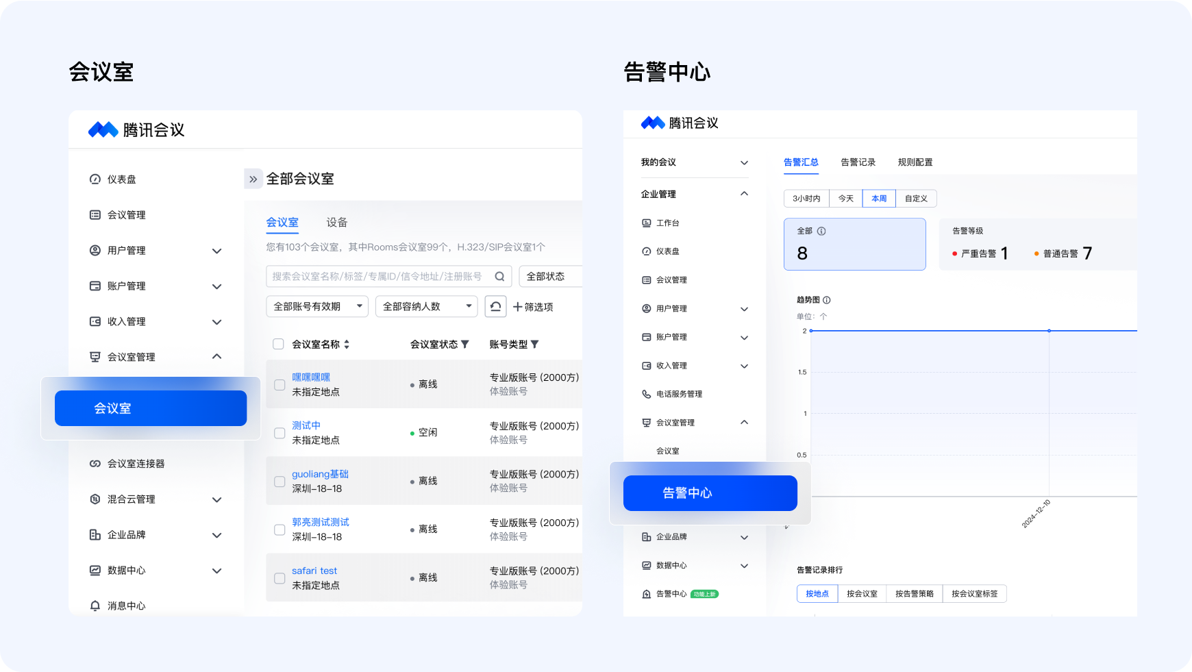 在企業(yè)管理后臺-【會議室管理】中,您可以添加本地會議室,并配置Rooms賬號,以便實現(xiàn)統(tǒng)一管理。同時,企管后臺為您提供告警中心,按需配置不同的規(guī)則后,在會議室異常情況下,會向您發(fā)出告警,助力您快速解決問題。