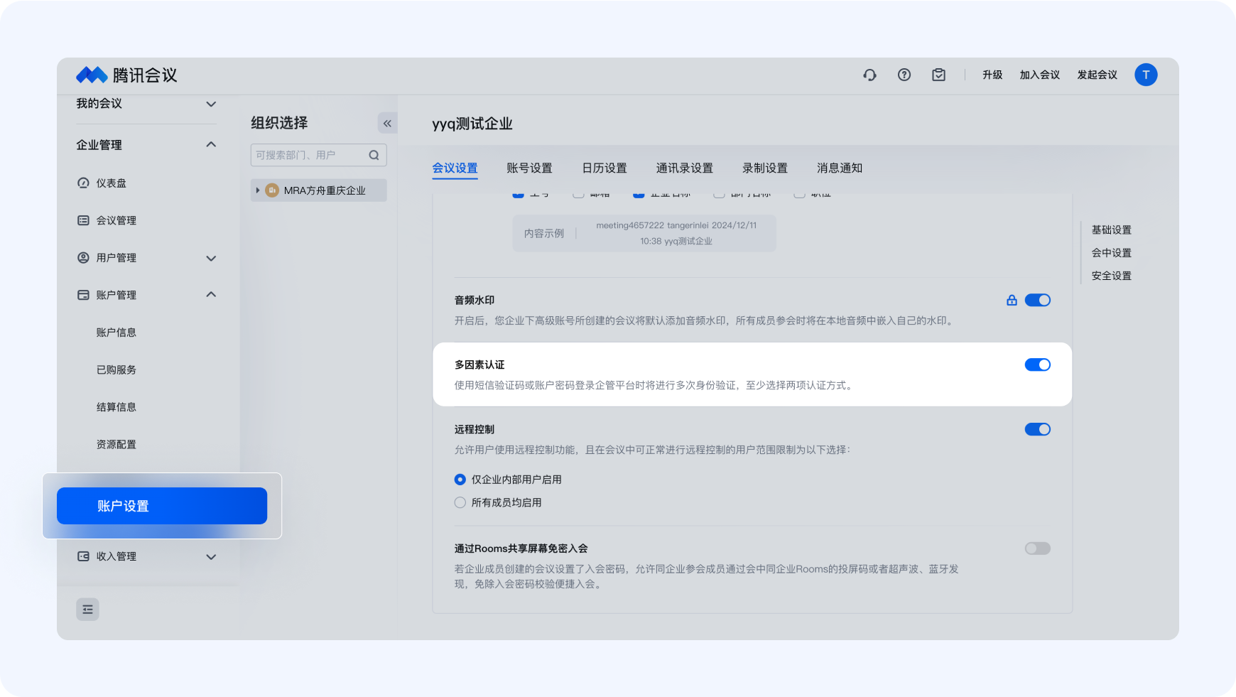 您可以前往企業管理后臺-【賬戶管理】-【賬戶設置】-【會議設置】中開啟【多因素認證】。開啟后若企業員工賬號在新設備上使用,騰訊會議支持要求進行二次核驗,企業員工可通過手機驗證碼或舊設備授權兩種方式進行驗證,避免被盜號登錄的風險。