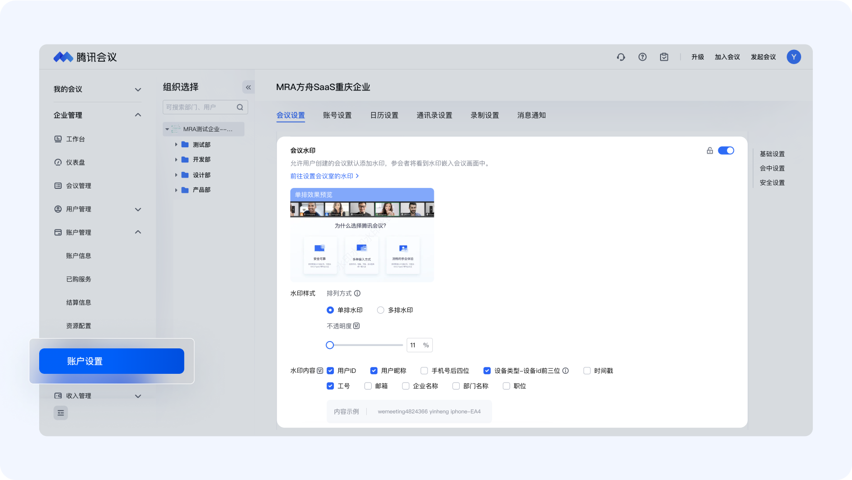 您可以前往企管后臺-【賬戶管理】-【賬戶設置】-【會議設置】中調整水印的樣式、內容,開啟多排水印后,組織內用戶創建的會議在共享屏幕時將添加水印,參會者將看到水印嵌入會議畫面中。