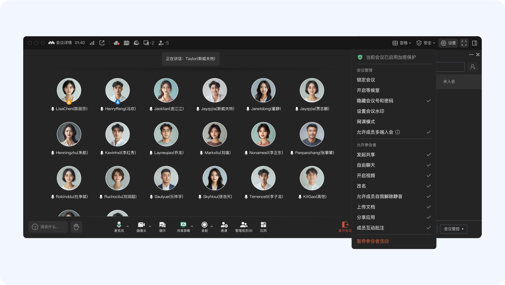 我們為會議主持人提供包括會議密碼、等候室、鎖定會議、一鍵全體靜音、共享屏幕等安全能力,讓主持人能充分把控會議秩序,防止重要內容泄露。如遇緊急情況,還可選擇“一鍵暫停參會者活動”,馬上恢復會議秩序。