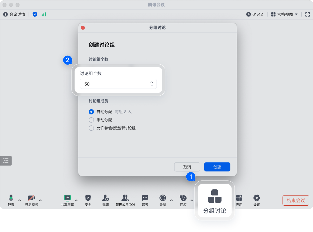 大容量的同時,商業版也做好了“秩序管理”,一方面,商業版單場會議至多設置50個分組討論,不用新開會議即可在原有會議號里分組討論,提升培訓、課程等場景下的互動感。
