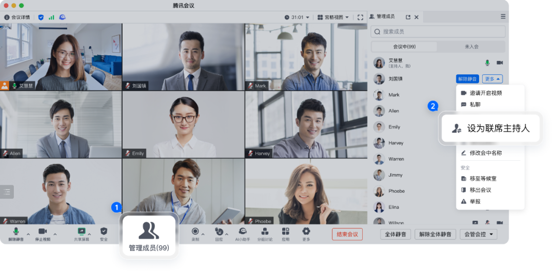 另一方面,商業版每場會議,支持最高10位聯席主持人,擁有主持人同等權限,可以對參會者的開關麥、視頻以及其他協作權限進行管控,并審批等候室中的人員,讓大型會議也井然有序。