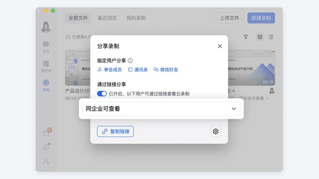 對于主持人來說,還有個非常省心的地方。會議結束后,會議云錄制文件能夠一鍵設置為“同企業可查看”,主持人再也不用當“工具人”逐一審批了。