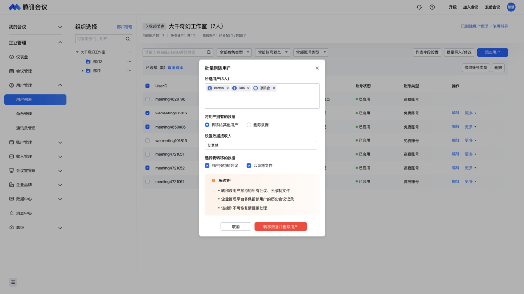 騰訊會議商業版/企業版提供了離職繼承管理能力,企業管理員可以在管理后臺將離職員工名下的會議資產(云錄制、待開會議)進行刪除或者直接轉移給其他同事,確保離職帶不走,新人可繼承,讓會議資產在企業內部安全地留存、流動。同時,我們還支持批量轉移給同一個同事,方便管理員操作。