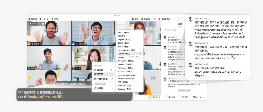 當我們召開多語言會議時,您就可以使用騰訊會議的翻譯功能,支持17種語言:中文、英語、日語、韓語、俄語、泰語、印尼語、越南語、馬來語、菲律賓語、葡萄牙語、土耳其語、阿拉伯語、西班牙語、印地語、法語、德語。搭配AI小助手以及智能錄制使用,讓您更快捷抓住會議重點,梳理待辦。