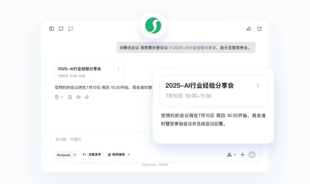 ?? 會議日程撞車或是臨時有事,還可以讓由騰訊元寶提供服務的「AI托管」幫你聽會和總結。
