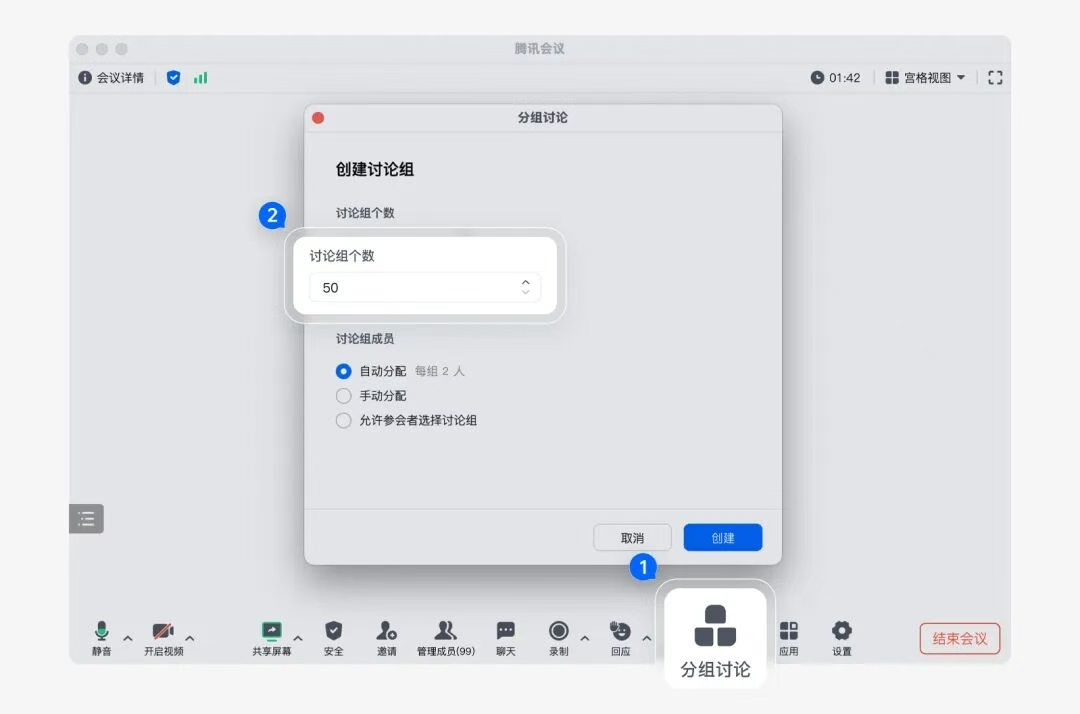 商業版支持最高50個分組討論、專業版支持最高2個,年底業績沖刺培訓會里參會者不用換會議號,原會議號里輕松切小組,培訓也能開得像教室分桌一樣有互動感。