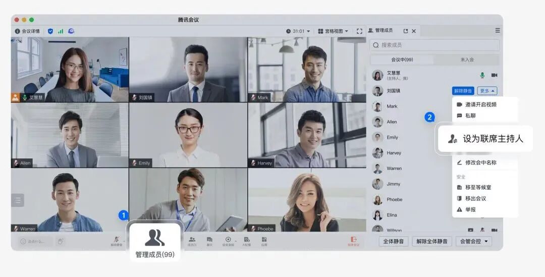 年終答謝活動會上,用上多位聯席主持人一起維持現場秩序——審批進場、控麥控視頻、管權限,一個不落。商業版最高支持10位,專業版最高支持4位噢!