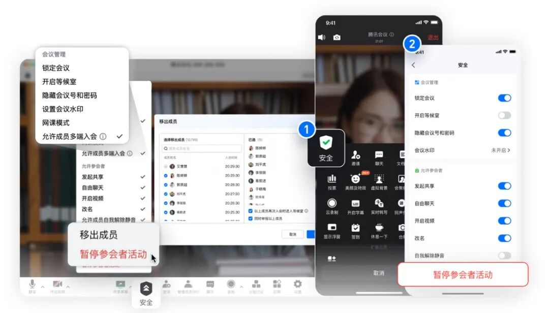 同時,還為您提供包括會議密碼、等候室、鎖定會議、一鍵全體靜音、共享屏幕等權限管控,讓會議主持人和聯席主持人一塊把控好會議秩序,防止重要內容泄露。如遇緊急情況,還可選擇“一鍵暫停參會者活動”,馬上恢復會議秩序。