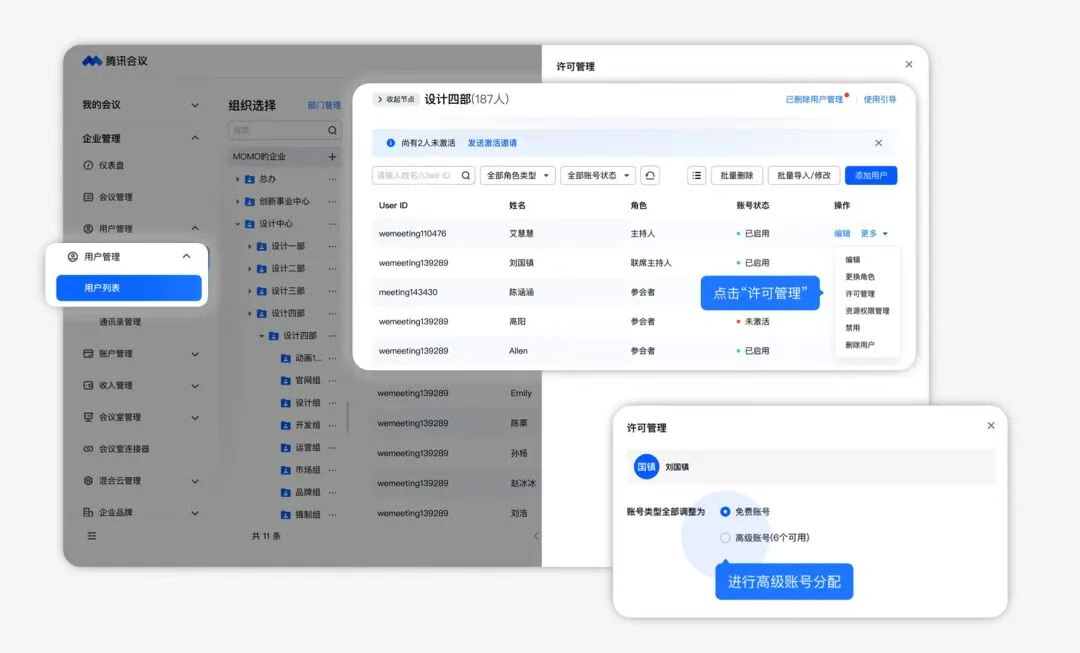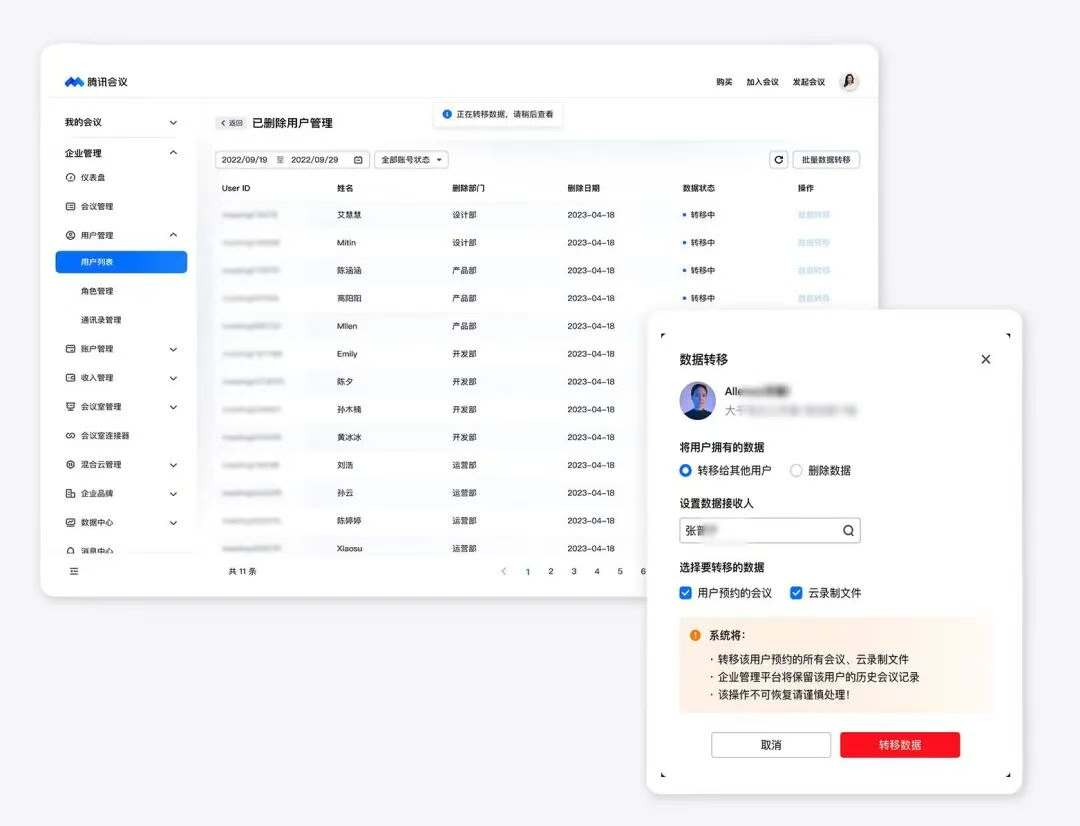 現在,前往活動頁下單,統一購買和分配給員工的商業版高級賬號歸屬您的企業所有,可重新分配給其他企業成員,并且支持對離職員工賬號下的會議資產(待開會議、云錄制等)進行刪除或者轉移給其他同事,高效交接,保障會議資產的安全流轉。
