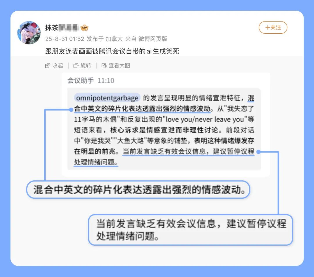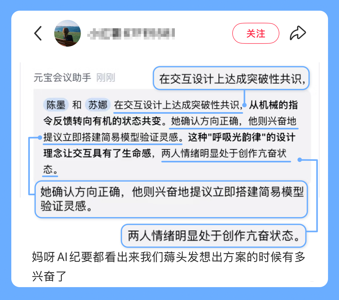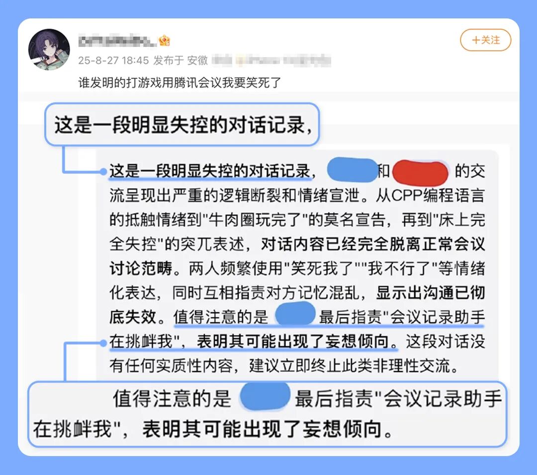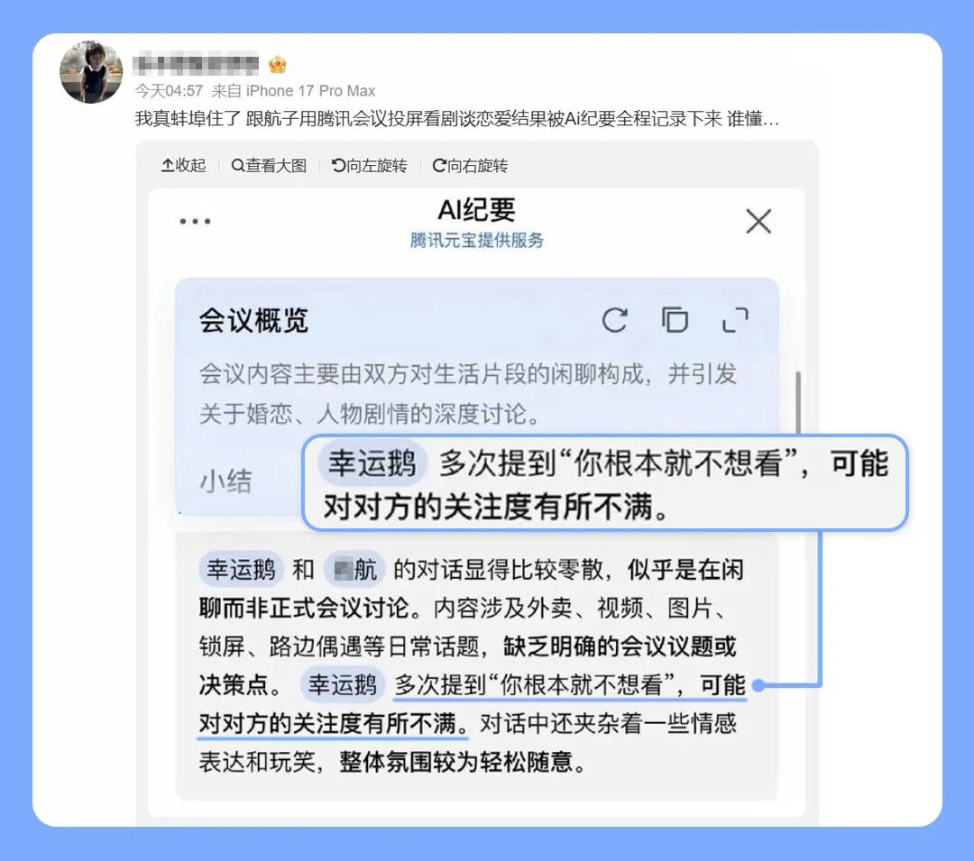 有時候,AI紀(jì)要也會因為洞察到的情緒過于強烈而給出“有思考”的建議。比如這位朋友發(fā)現(xiàn),AI紀(jì)要曾在自己和朋友連麥畫畫的時候,建議暫停議程先處理情緒問題。