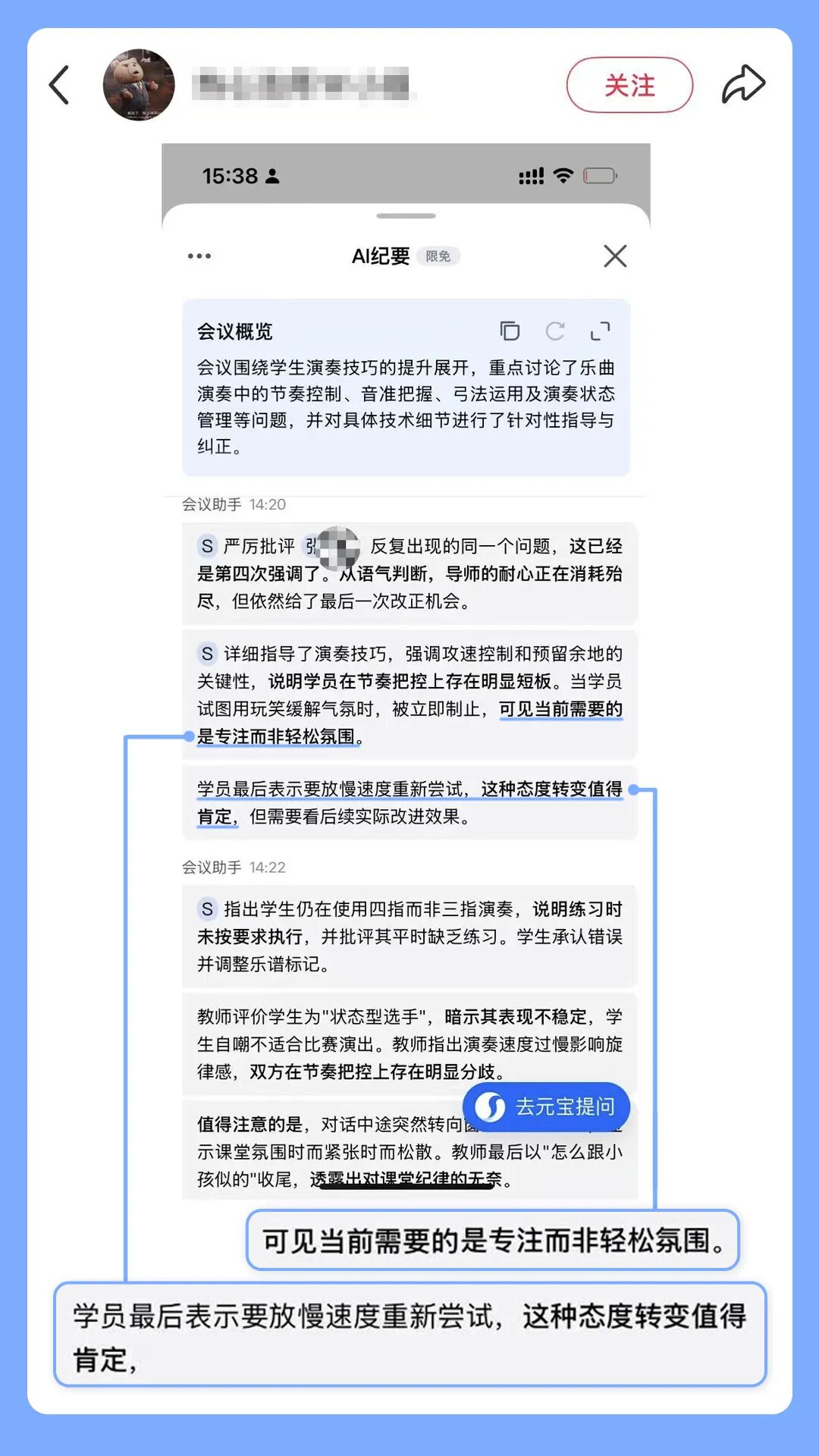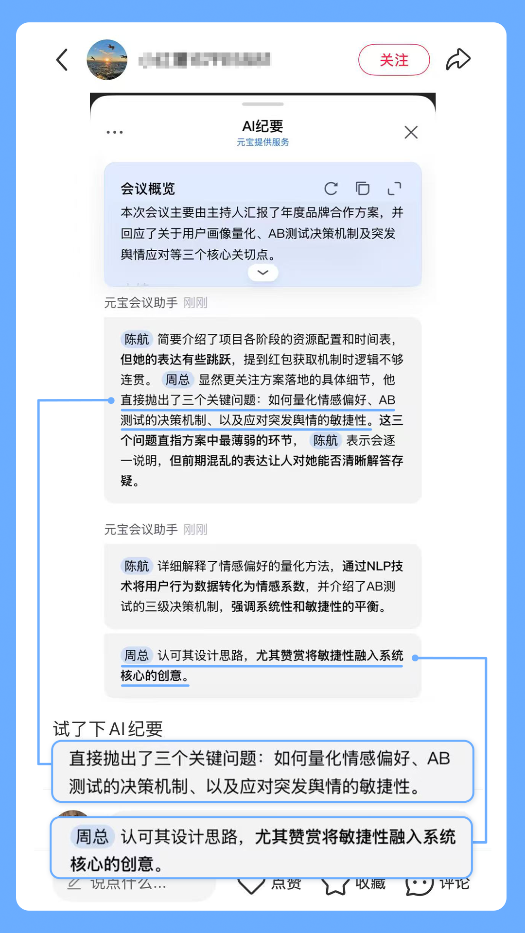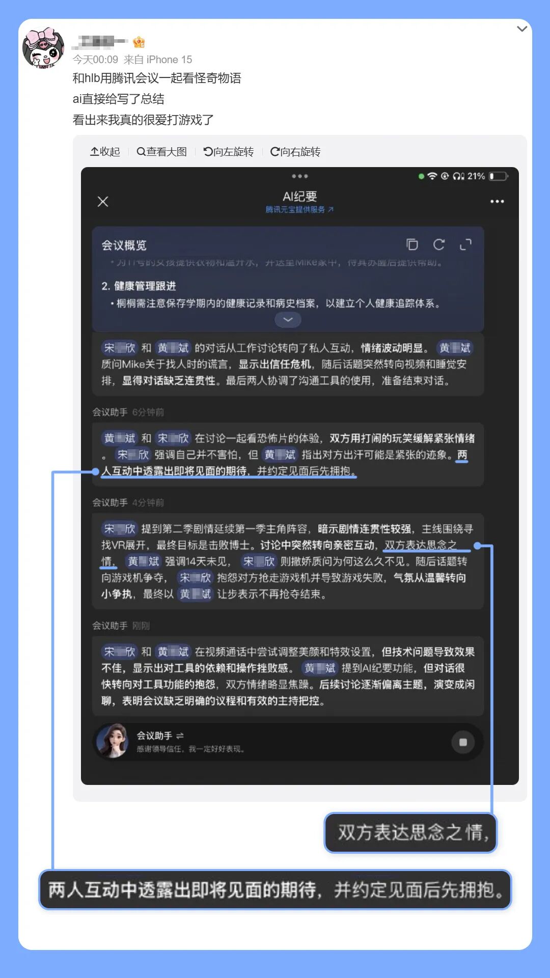 有時候,AI紀(jì)要也會因為洞察到的情緒過于強烈而給出“有思考”的建議。比如這位朋友發(fā)現(xiàn),AI紀(jì)要曾在自己和朋友連麥畫畫的時候,建議暫停議程先處理情緒問題。