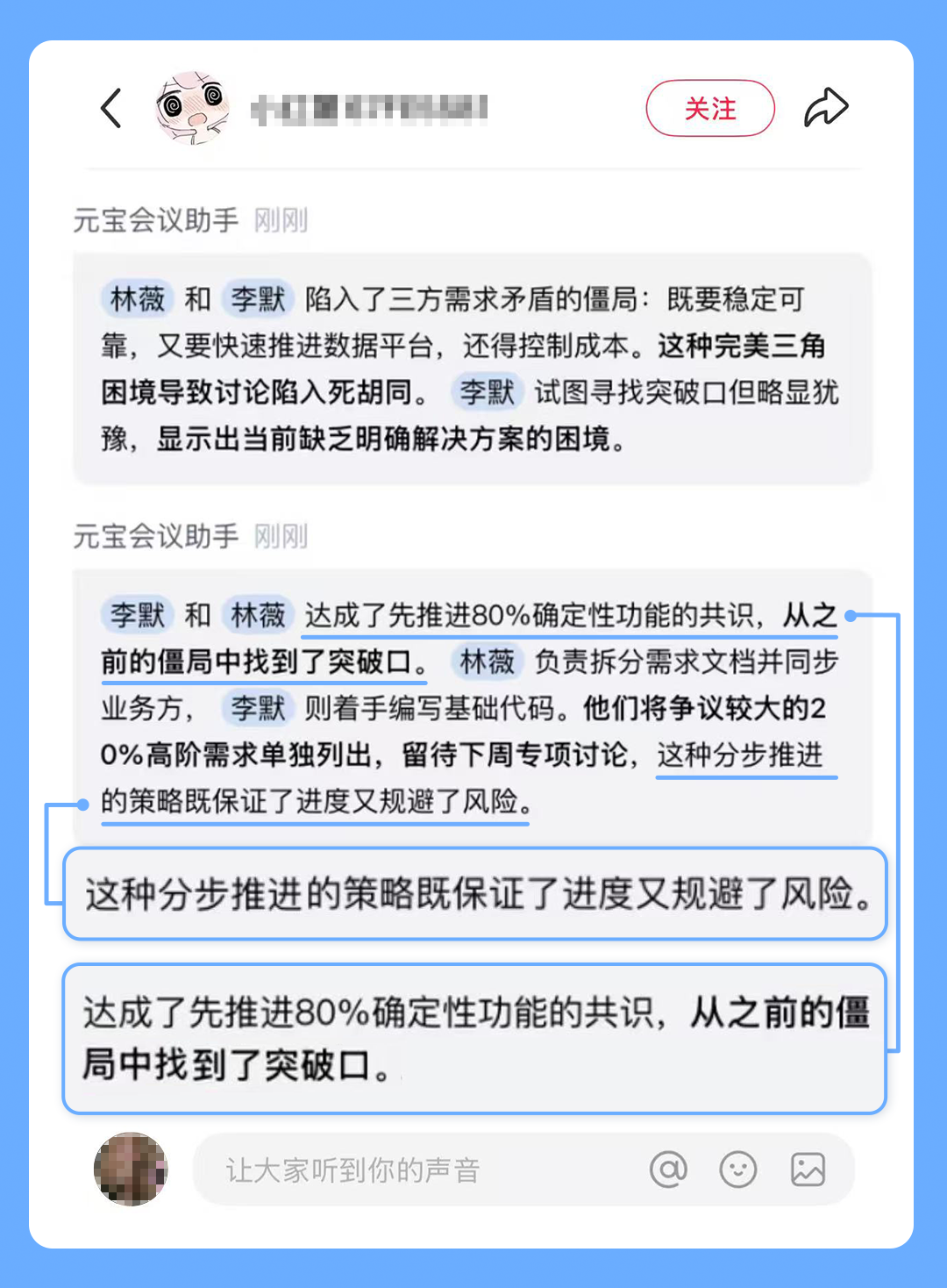 今年你跟同事進(jìn)行了幾次對接,你們在某個節(jié)點同時察覺到了討論的瓶頸。你們同時選擇了:“先推進(jìn)能確定的。”雖然無奈,但AI紀(jì)要里那些清晰拆解的待辦事項最后被你們逐一跟進(jìn)解決,那是專業(yè)協(xié)作中另一種珍貴的能力:在瓶頸處果斷暫停,將難題拆解成可解決的事項。