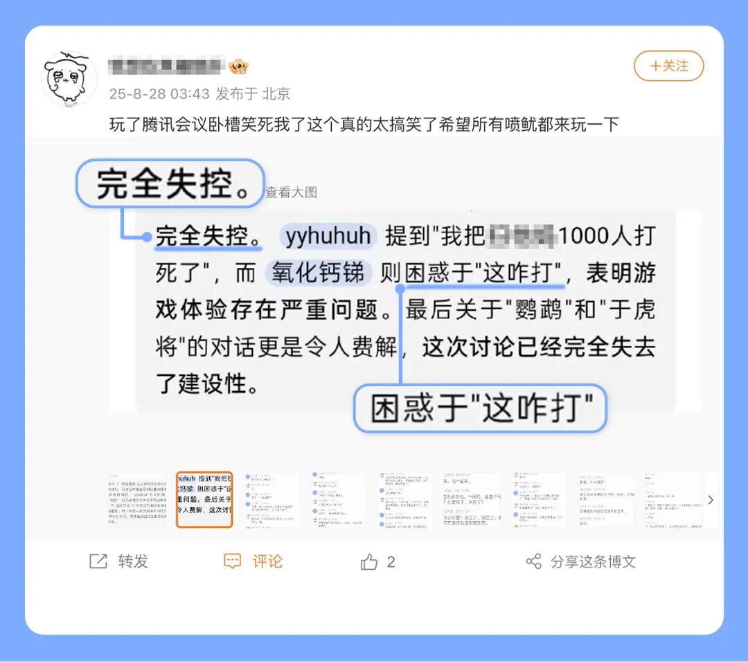 除了工作,AI紀(jì)要還記錄了很多意料之外的聲音。2025年,你發(fā)明了用騰訊會議連麥打游戲,“失控”是你的AI紀(jì)要高頻詞。但在這些“失控”的后面,緊隨其后的都是朋友們此起彼伏的歡笑聲。