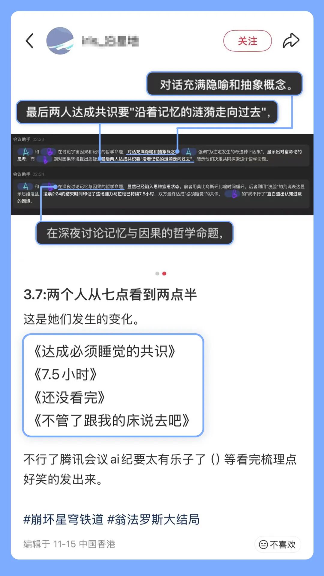 AI紀(jì)要也陪伴了你們7.5小時線上聊天,一起討論宇宙因果和記憶的哲學(xué)命題。下線時已是深夜,但AI紀(jì)要記得你們共享過同一片思想的星空。