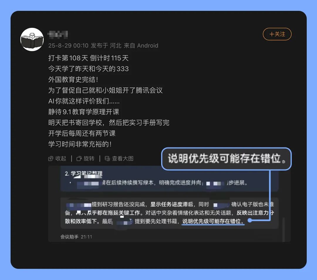 即使是你們和同學(xué)一起充實的云自習(xí),AI紀(jì)要也會提醒關(guān)注優(yōu)先級,關(guān)注注意力和效率的提升。希望你們這個學(xué)期的考試成績都十分滿意!